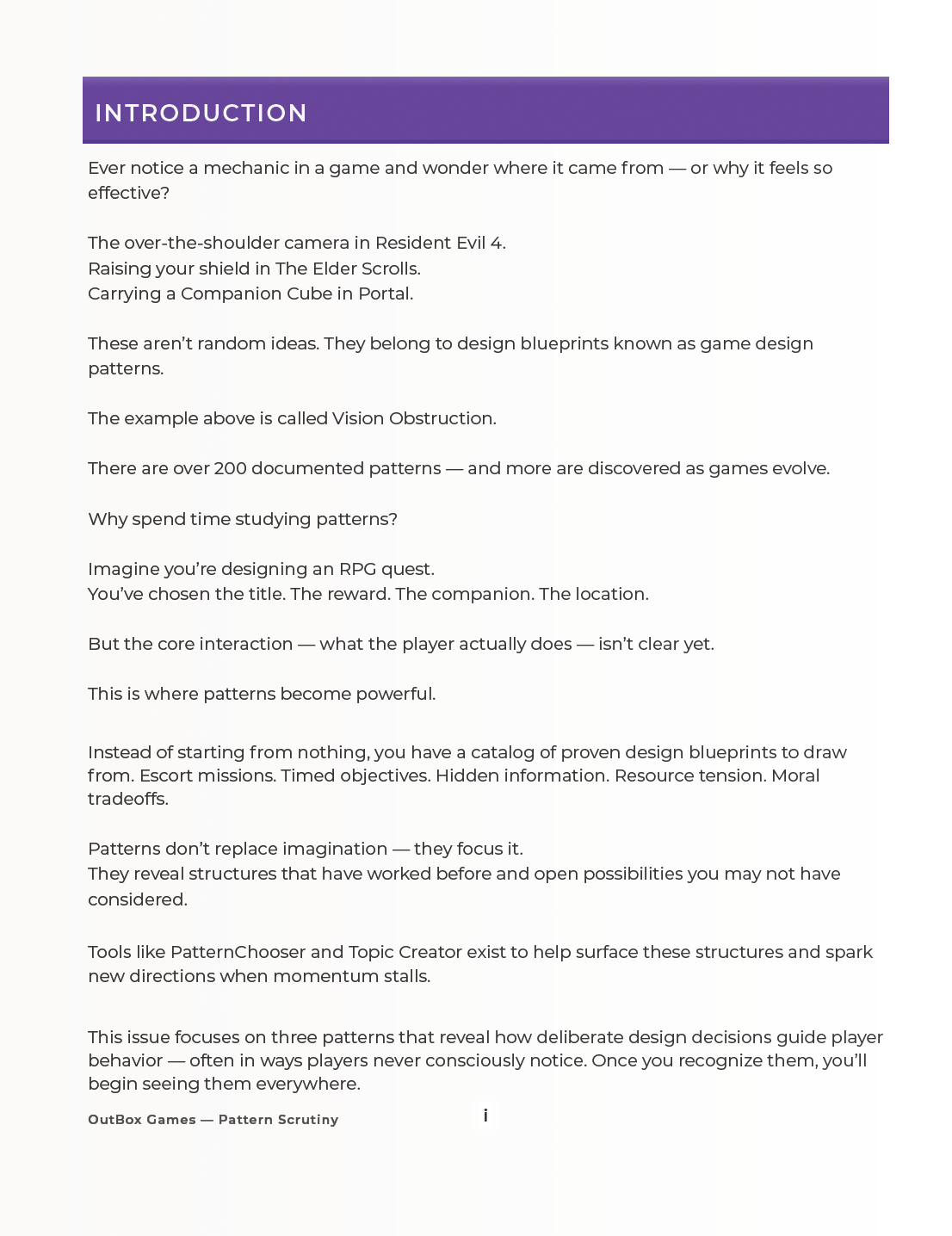 Pattern Scrutiny is an ongoing publication exploring game design patterns.